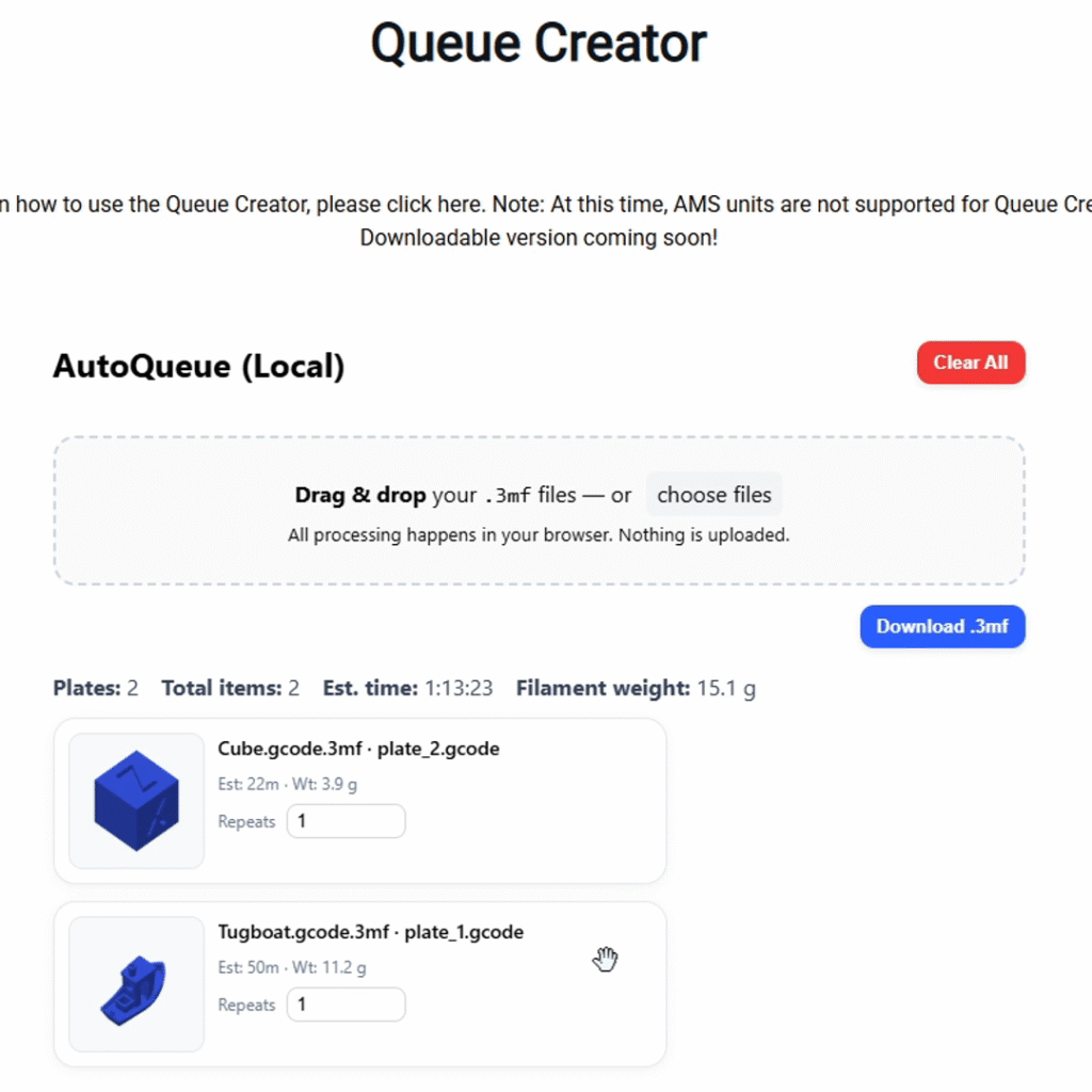 No coding, no hassle. With the free Queue Creator, you just drag-and-drop in your exported printer files, and it automatically stitches the G-code together into a single queue. Export the queue, load it onto your A1 Mini, and the AutoQueue takes care of the rest.