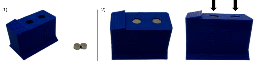 2. Press the magnets into their respective holes on the top of the Back Snag, ensuring a snug fit. The magnets should sit just below the top surface of the Back Snag. It may be useful to turn the Back Snag upside down and press the magnets in by using the edge of a hard table.