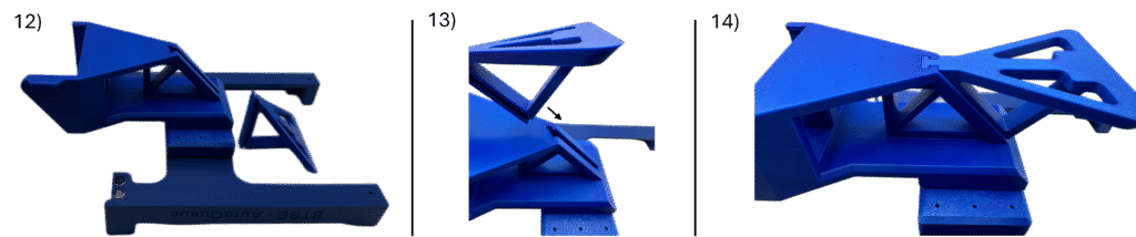 16. Insert the Back Latch into the front of the Back Housing Assembly, lining up the holes in the Back Latch with the holes on top of the Back Housing Assembly. At this point, double check to confirm that this is the Back Latch (this part has inscribed “B”s on top, as opposed to the Front Latch which has inscribed “F”s on top) and that the Back Latch is in the correct orientation (the inscribed “B”s should be facing upward)