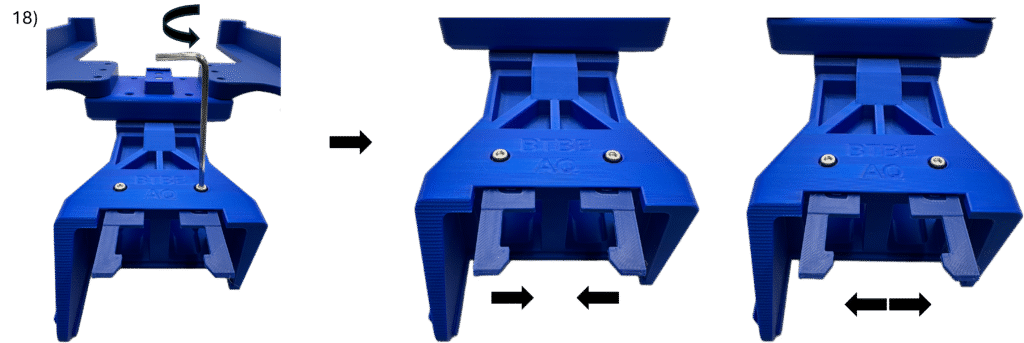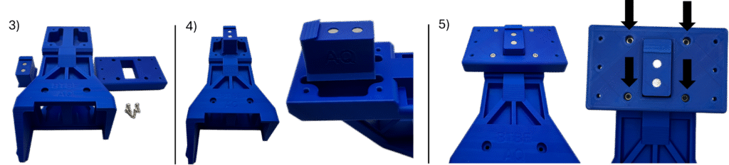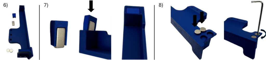 8. Insert the two Medium Magnets into their respective holes on the underside of the Back Arm – Left, ensuring a snug fit. This may be difficult, as the fit is tight to ensure the magnets stay in place – it may be useful to use the edge of a table, or use an Allen Wrench to help force the magnet into position.