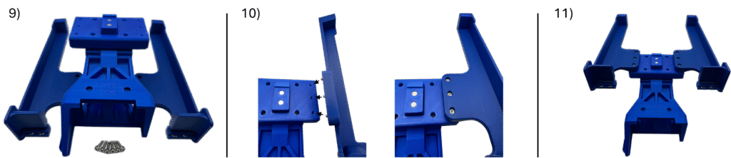 10. Insert three Assembly Screws into their respective holes on the Back Arm – Right, align with the holes on the right side of the Back Riser on the Back Assembly, and slowly fully tighten using the 3mm Allen Wrench.