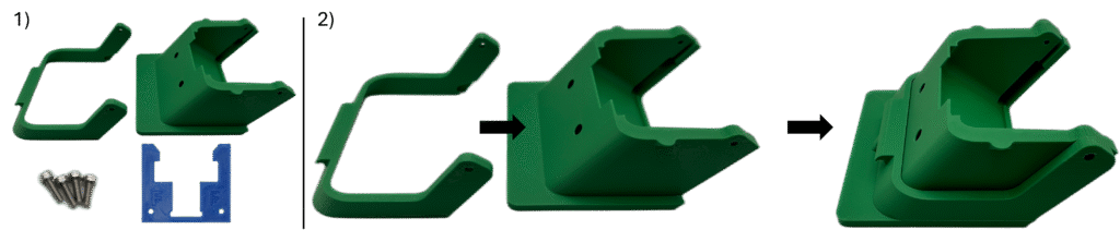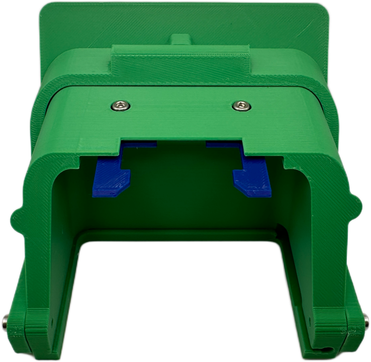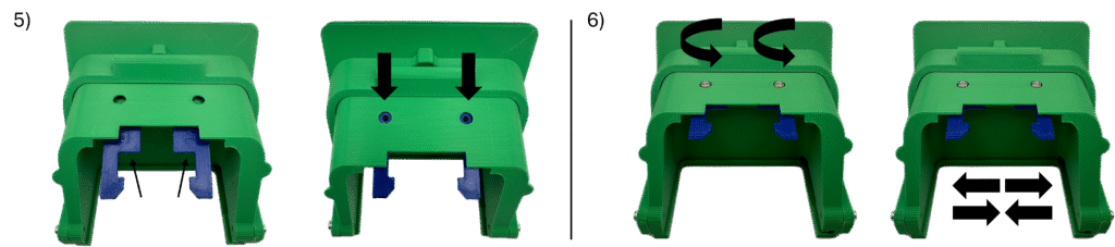 5. Insert the Front Latch into the slot in the front of the Front Base and the holes in the Front Latch with the holes on top of the Front Base. At this point, double check to confirm that this is the Front Latch (this part has inscribed “F”s on top, as opposed to the Back Latch which has inscribed “F”s on top) and that the Front Latch is in the correct orientation (the inscribed “F”s should be facing upward)