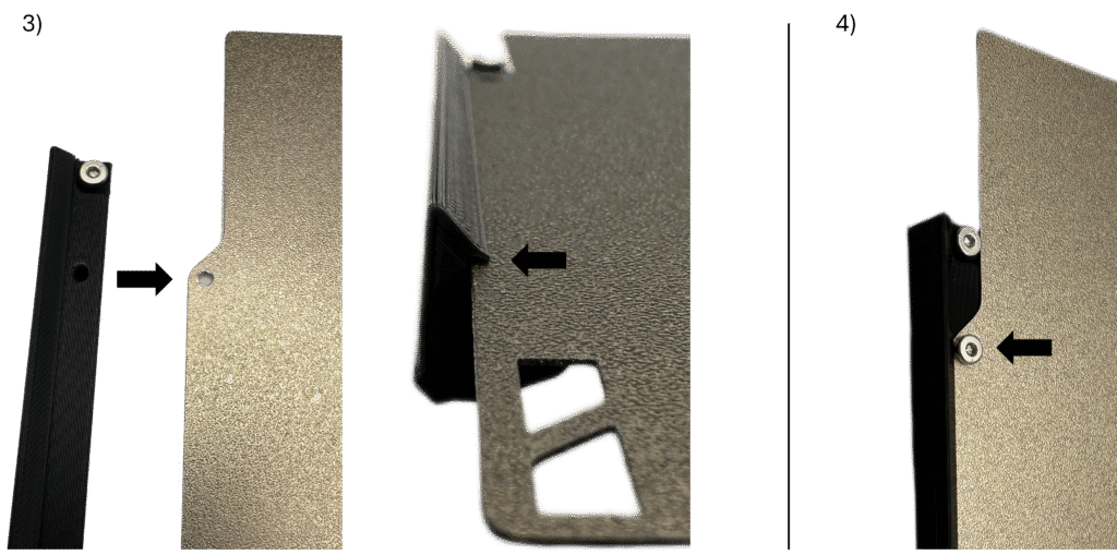 2. Use the Smaller Allen Wrench to insert and slowly fully tighten one of the Plate Hook Screws into the outer-most hole on the Plate Hook. The Plate Hooks are symmetrical – either outer-most hole can be used. For this guide, the right-most hole is selected.
