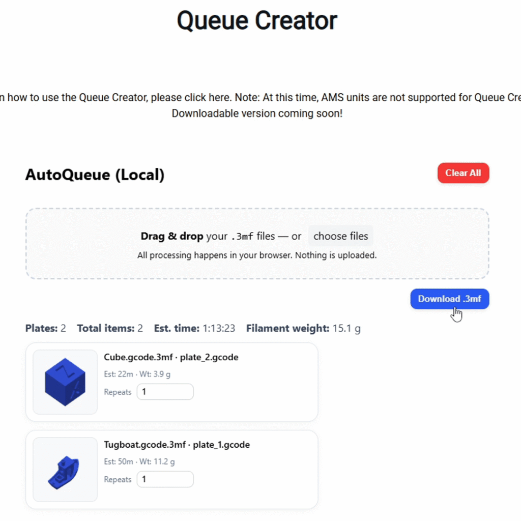 2. Either select the “choose files” option to select all .gcode.3mf files as previously exported from the Bambu Studio “Export plate sliced file” option, or directly drag-and-drop those files into the “Drag & drop” area in the Queue Creator.